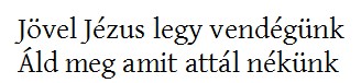 Before each meal, the group will be asked for a Volunteer to say Grace. After the on-the-spot prayer, we have two prayers we all say together, one in English and one in Hungarian: